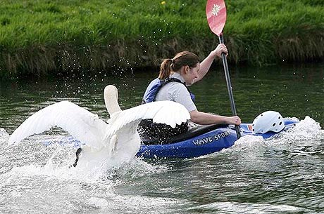 Con thiên nga có biệt anh "Ông Asbo", nỗi kinh hoàng của những người chèo thuyền trên sông Cam, đang đuổi theo một nữ sinh Cambridge. Ảnh: Masons News Service.
