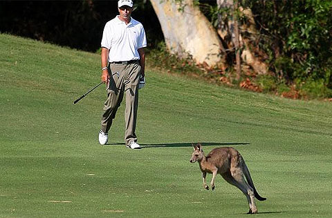 Kangaroo nhảy qua sân golf ở Sunshine Coast, Australia. Ảnh: Getty.
