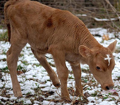 Bê con Moses có vệt lông hình dấu thánh giá giữa trán đang nhẩn nha gặm cỏ trên cánh đồng ở Sterling, Connecticut, Mỹ. Ảnh: AP.