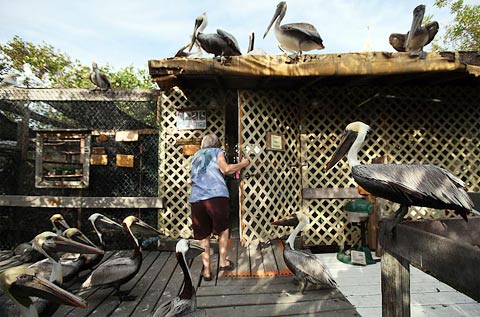 Đàn chim vây quanh nhân viên ở trung tâm tái định cư cho động vật hoang dã ở Florida, Mỹ, để chờ ăn. Ảnh: Getty. |