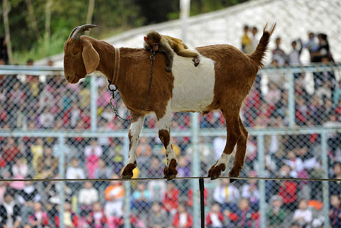 Một con dê và con khỉ làm xiếc trên dây. Ảnh: Reuters.