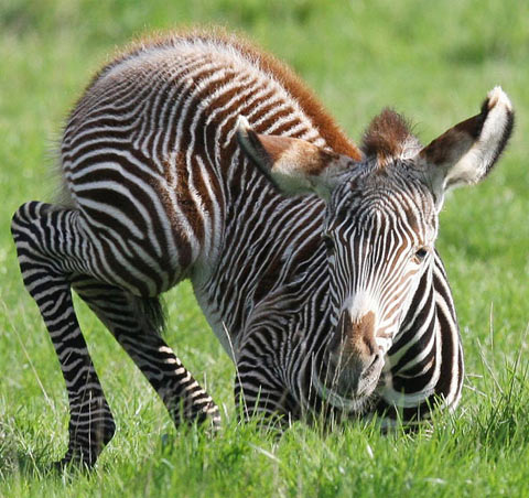 Ngựa vằn con chơi đùa trên thảm cỏ ở Dunstable, Anh. (Ảnh: PA).