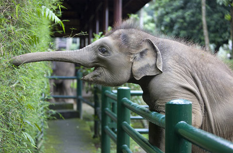 Voi con vươn chiếc vòi dài lấy cỏ trên đảo Bali, Indonesia. (Ảnh: Solentnews).