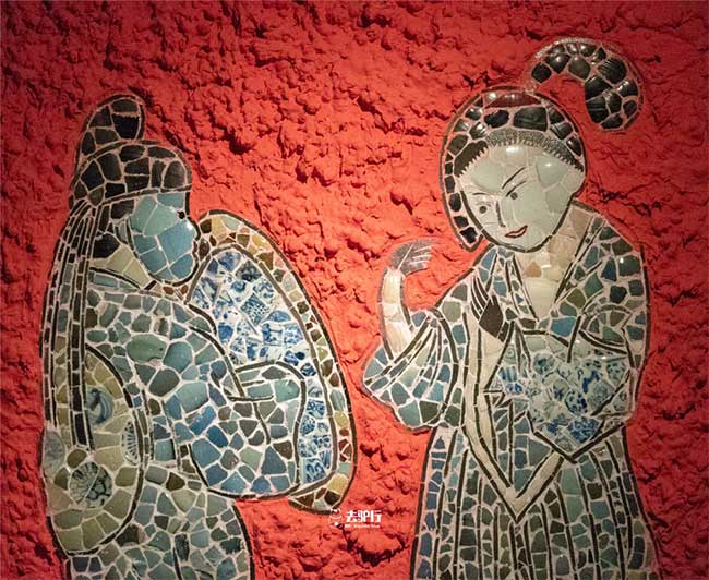 Bức tường được ốp bằng những bình sứ, những viên ngói, những món đồ cổ với sắc màu...