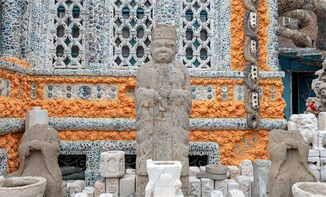 Ngay từ lúc bước xuống xe, du khách sẽ choáng ngợp bởi bức tường được ốp bằng những bình sứ, những viên ngói, những món đồ cổ với sắc màu, hình dáng phong phú. Chúng được xếp ngăn nắp gọn gàng thành tầng lớp với số lượng lớn khiến du khách hoa mắt.