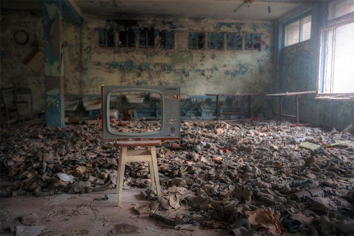 Chiếc TV còn sót lại phần khung, đứng trơ trọi trong căn phòng. Trên sàn nhà, hàng loạt mặt nạ chống độc bị vứt bỏ, nằm vương vãi sau khi người dân nhanh chóng sơ tán ra khỏi vùng thảm họa.