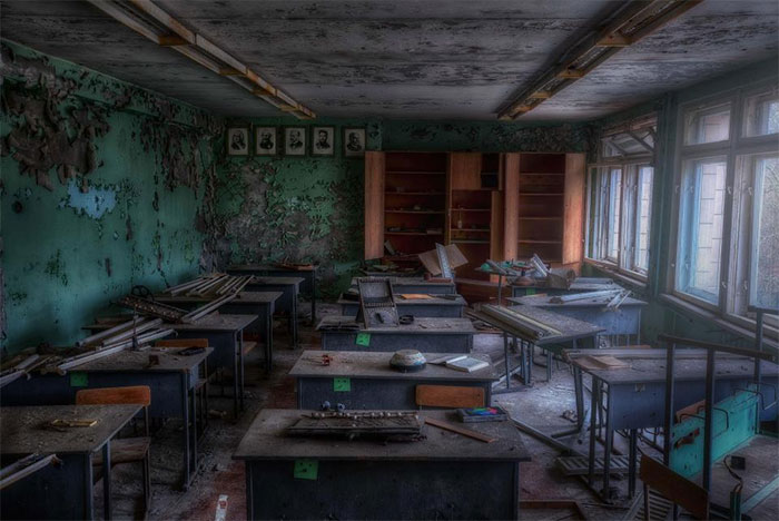 Những gì còn sót lại tại một trường học sau 32 năm thảm họa: bàn ghế ngổn ngang, trần nhà hư hại, các đồ vật phủ bụi theo thời gian.